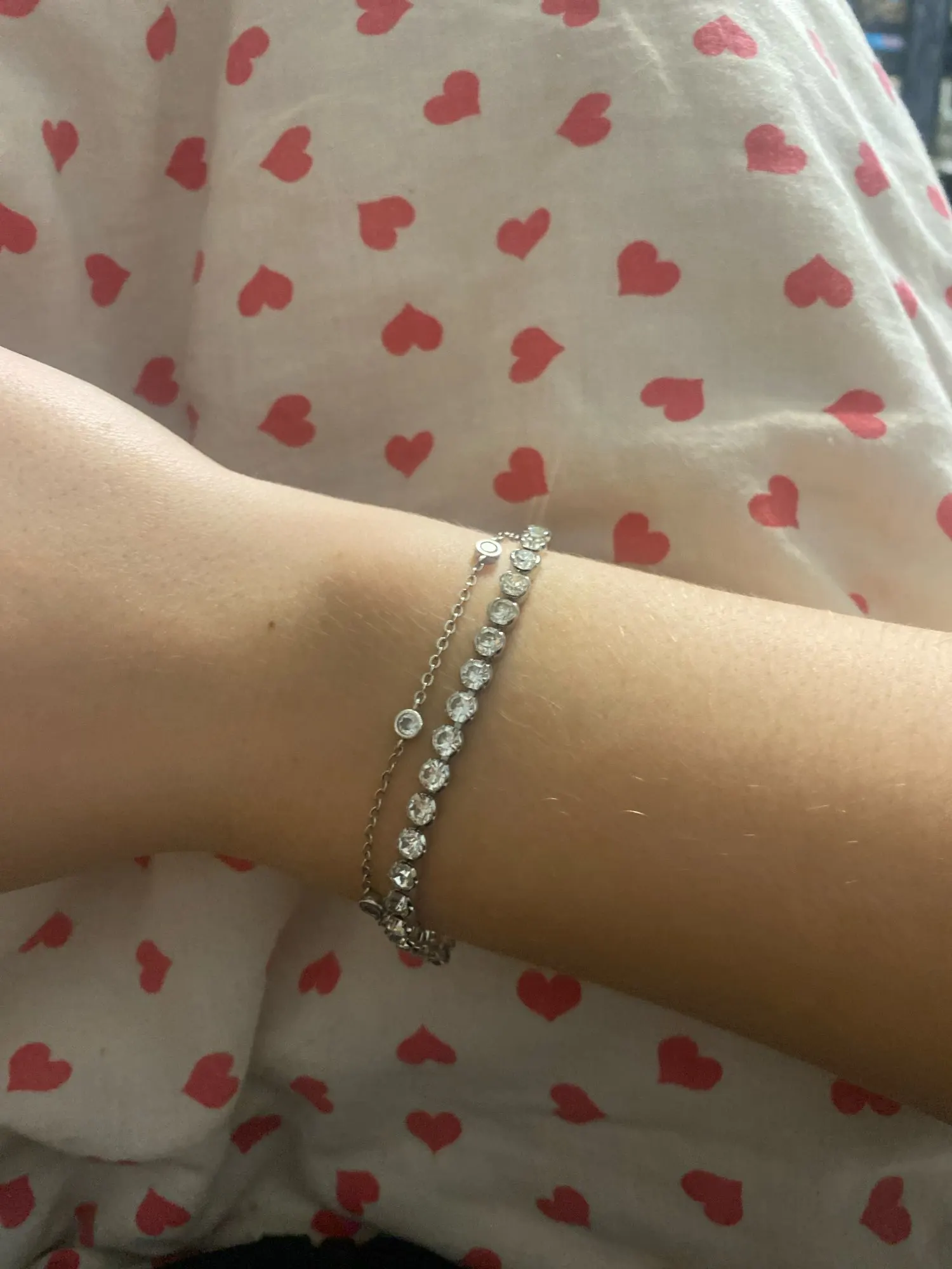 Lorena Hansen Beautiful bracelet, doesn't turn black or tear like most tennis bracelets. But keep in mind that it's small. I actually thought it wouldn't fit and that it was for children since my wrist is 16.5 cm and it fits just right.